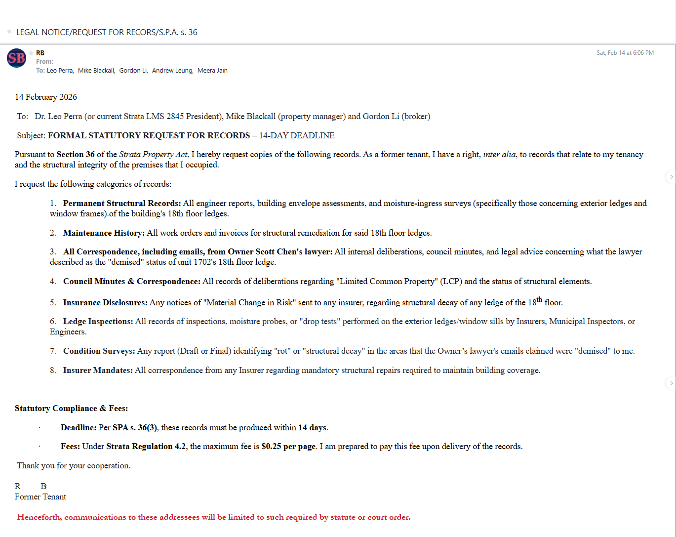 3. Necessity of Professional Action: De jure fiduciaries of the Strata Owners (Attorneys Lauren Liang, Meera Jain, Nigel Beckmann, Property Manager Mike Blackall and Insurance Broker Gordon Li have been duly notified of these and other issues, in order to ensure that the building’s risk profile be accurately managed. Taking proactive action allows the tripartite group to address these lifecycle failures before they result in sudden structural or mechanical loss.