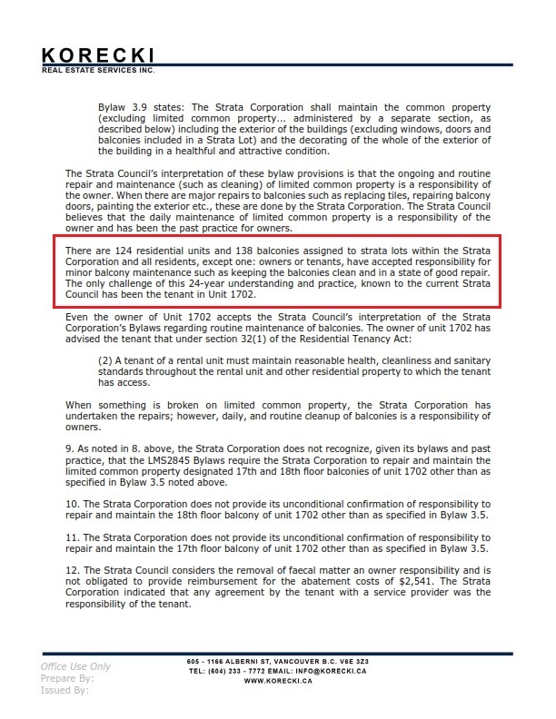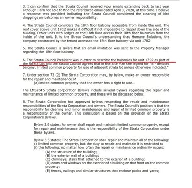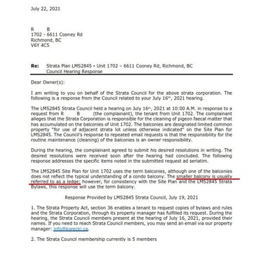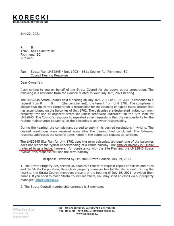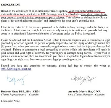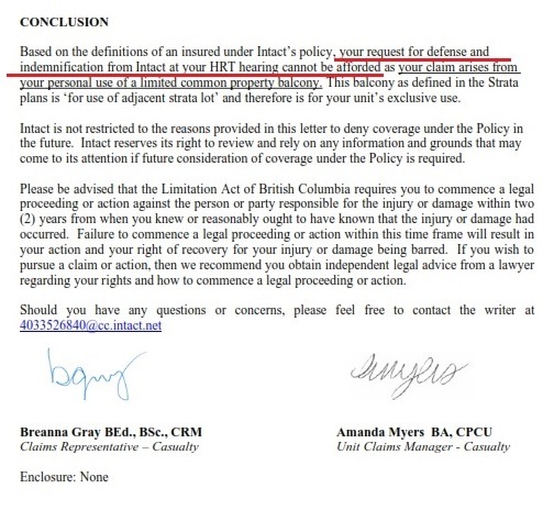 "Based on the definitions of an insured under Intact’s policy, your request for defense and indemnification from Intact at your HRT [sic] hearing cannot be afforded as your claim arises from your personal use of a limited common property balcony. This balcony as defined in the Strata plans is ‘for use of adjacent strata lot’ and therefore is for your unit’s exclusive use."