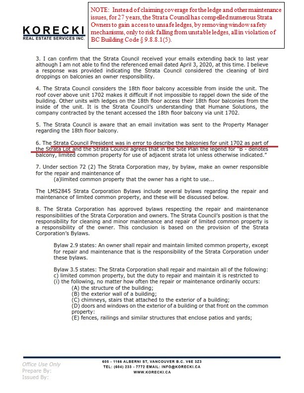 This unstable ledge was the precise area that SLAPP Plaintiff Christa Rae Cordick accused the SLAPP Defendant of occupying, and the Strata Corporation of having neither control nor legal responsibility to maintain, in her pleadings in the Provincial Court and Affidavit filed in the Supreme Court, infra.
