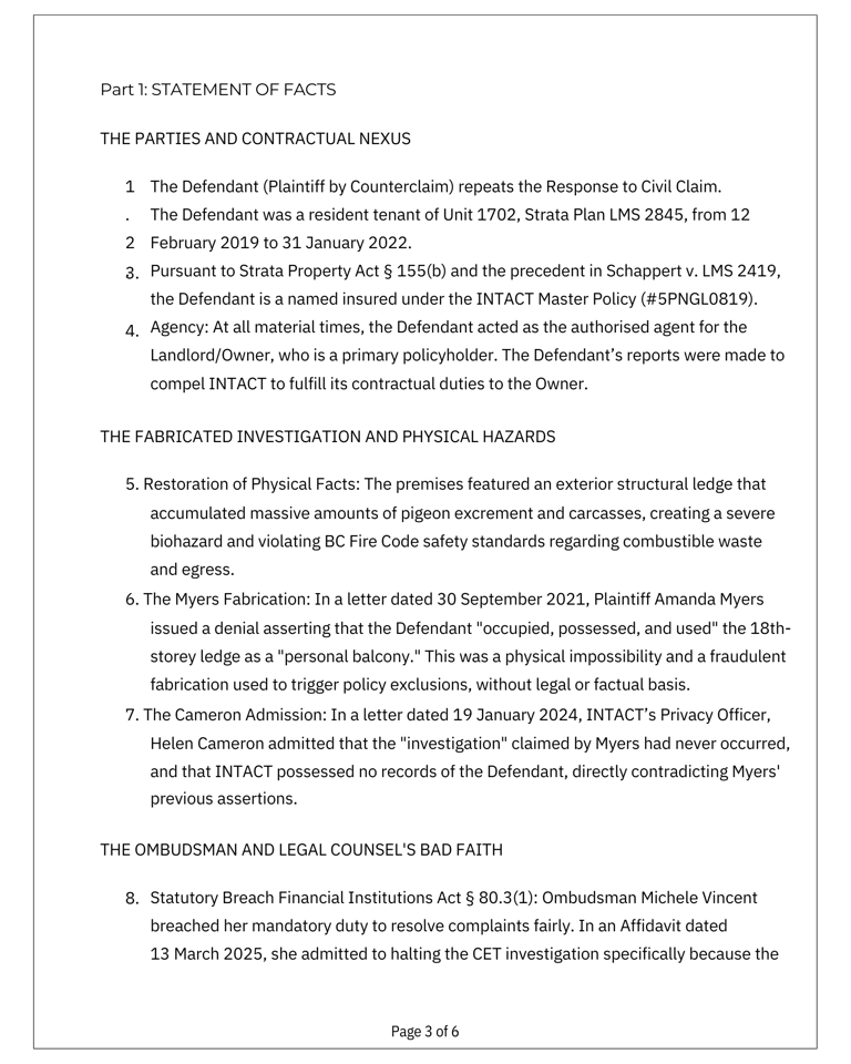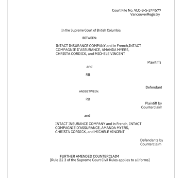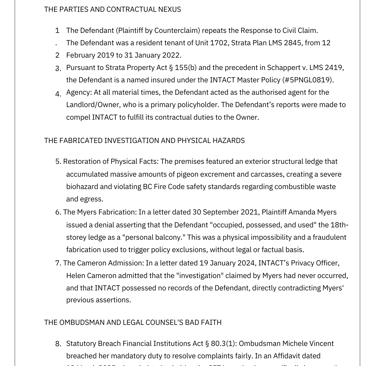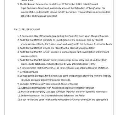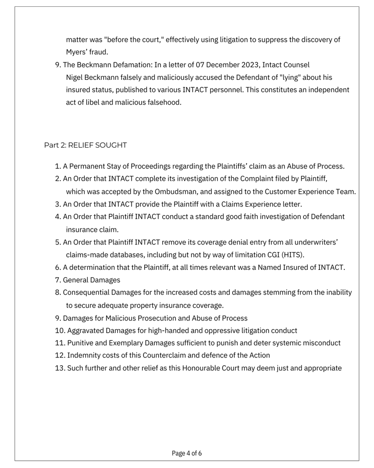 30 JANUARY 2025 As detailed below, the Defendant of Plaintiff INTACT's and its personnel's civil actions had made the below offer to permanently surrender exclusive control of this website to the Plaintiffs, subject to the terms thereof. On 21 January 2025, Plaintiffs' lawyer from Whitelaw-Twining rejected said offer, by rendering a counteroffer, to remove everything from this website (including facts complimentary of INTACT CEO Brindamour). Plaintiffs' lawyer's bad faith counteroffer was to effectively remove this website from the internet, with the result of a blank screen page. Pursuant to Supreme Court Rule 1-3, Rule 7-1 and Part V, Defendant has reinstated the Offer, which remains valid until the expiry of the above countdown. Never again will it be reinstated! In the absence of Plaintiffs' timely acceptance of the Offer, at trial they will each be required to identify all instances of defamation on the website that justify their filing of the two (2) civil actions against the Defendant. If they should fail to meet this solemn threshold, then a civil action for abuse of process will be pursued against them, guaranteed! 22 JANUARY 2025 "Nulla est terminus malitiae socii Whitelaw-Twining." According to the Whitelaw-Twining Partner, his Clients, INTACT Insurance, Claims Manager Amanda Myers, Counsel Christa Rae Cordick and Ombudsman Michele Vincent have all formally rejected Defendant's herein Offer to grant them the unconditional right to strip the subject website of all words that any of them should believe defamatory, without need of reason, nor explanation. As the below email from INTACT's lawyer from Whitelaw-Twining confirms, with reference to this website, the Plaintiffs all "claim that every single word, image, sentence, and representation is defamatory". Although the Plaintiffs allege that "every single word, image, sentence, and representation is defamatory", a simple review reveals that more than 90% of its content is factual, such as correspondence authored and signed by each Plaintiff. Among the matters deemed by the Plaintiffs to be "defamatory" are facts, even worthy of judicial notice [such as Strata Property Act Section 155(b), and the case of Strata Plan VR 2213 v. Schappert, 2023 B.C.J. No. 2272, 2023 BCSC 2080, decided by the Honourable Justice Coval of the Supreme Court, where Plaintiffs filed their SLAPP actions forum of this . Other factual information on the public interest website includes citations of legislation, court filings, and even numerous, laudatory articles about Plaintiff INTACT and its CEO Brindamour and his "Living Our Values" noble initiative. Much content is complimentary, not defamatory, and certainly falls within the scope of protected free speech. The Whitelaw-Twining has proven that his intransigent, cynical approach has no limit. Thus, Defendant's Motion to dismiss the Plaintiffs' SLAPP actions has been redraughted, subject to more revisions, and filed, when appropriate and without notice to the subject offence lawyer.