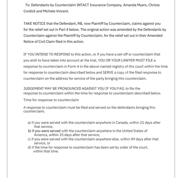 As indicated by the letter to the right, INTACT had confirmed the Claimant's status as a Named Insured of the company. However, as indicated by his letter to the left, Whitelaw-Twining's Partner contradicted INTACT's confirmations of the Claimant's status, by his false charge, defamatorily and falsely accusing the Claimant of submission of the insurance claim under the false pretence of being an insured. Below is a legal pleading of an INTACT lawyer, confirming the Claimant's legal status as a Named Insured.