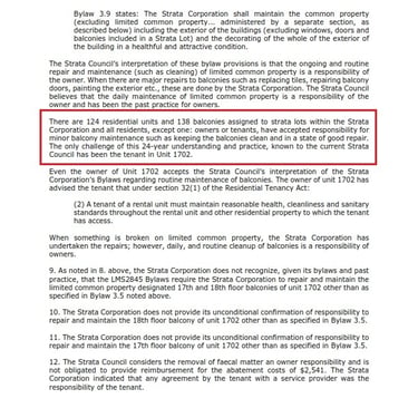 The insured Strata Corporation LMS2845 Bylaw 3.9 states: "The Strata Corporation shall maintain the common property ) and the decorating of the whole of the exterior of the building in a healthful and attractive condition".