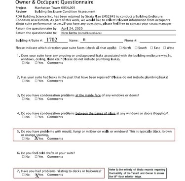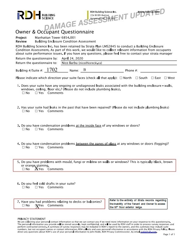 1. Unique Viewpoint & Access For 29 years, these conditions remained undetected because they are invisible from unit interiors and inaccessible and undetectable to standard building inspectors, such as RDH Building Science, in its annual Building Condition Assessments (BCAs).