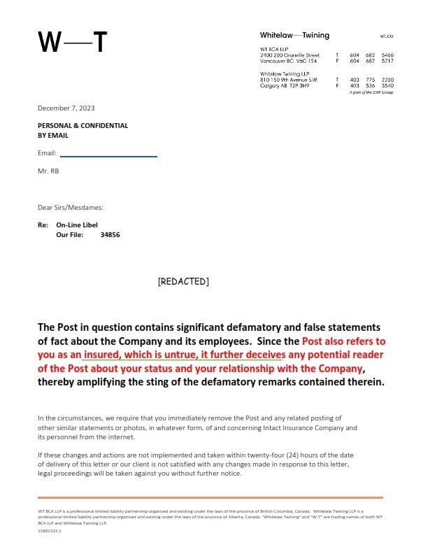 In a letter of 07 December 2023, a Partner of Whitelaw-Twining defamatorily accused the insured of wrongfully submitting his claim, under the false pretence of being an insured. The Partner admits to having published his defamatory letter with various claims personnel of INTACT.