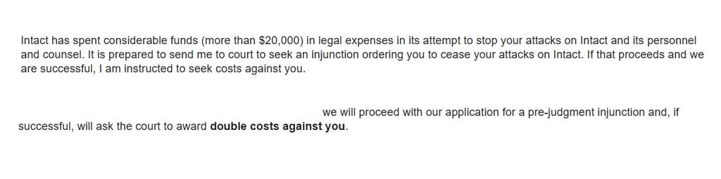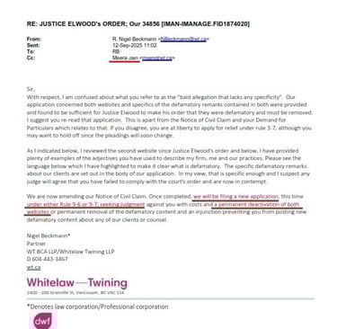 During INTACT's costly SLAPP prosecution, its counsel, Meera Jain (of a boutique style firm known as Whitelaw-Twining), continue to defy the herein documented Order of the Honourable Justice Elwood's Order, which denied INTACT's Application for permanent, or even interlocutory deactivation of this website.
