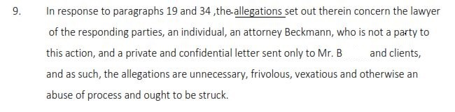 To the right is a (redacted for confidentiality) section of a legal pleading filed by Nigel Beckmann, in his SLAPP action against the Insured of a Whitelaw-Twining's Insurer/Client. The statement denying the insured's status of the Insurer/Client is simply false, according to Partner Beckmann's own Plaintiffs Clients!