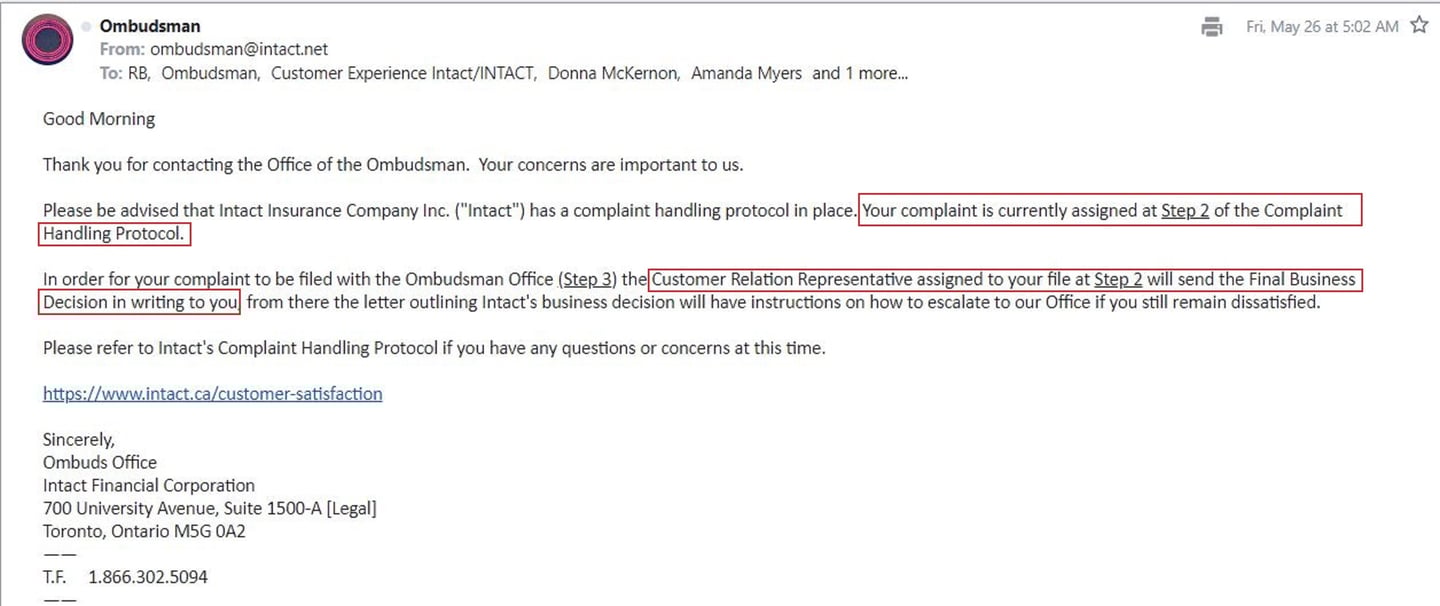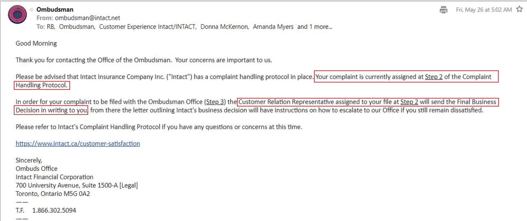 As abundantly documented on this public interest website, on 26 May 2023, Whitelaw-Twining's client Ombudswoman Michele Vincent acknowledged receipt of insured's formal Complaint of a Claims Manager's illicit denial of a property claim that he had filed with INTACT. Ms. Vincent confirmed that she had assigned the Complaint to the Customer Experience Team for investigation, upon completion of which the Customer Experience Team would provide the insured with a Final Business Decision (FBD) letter.