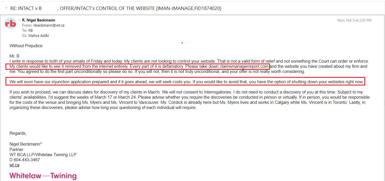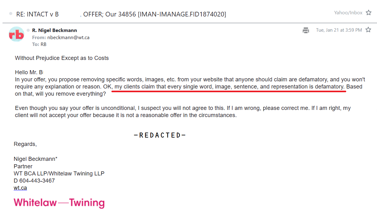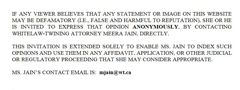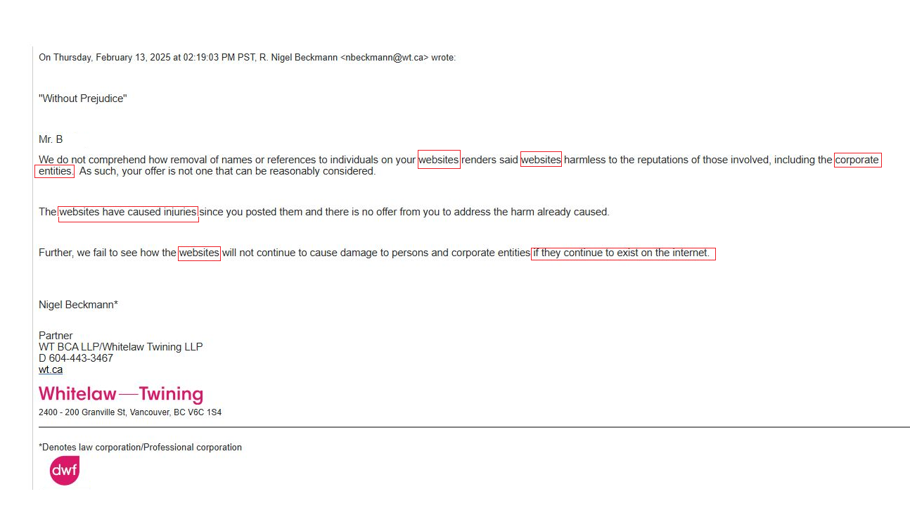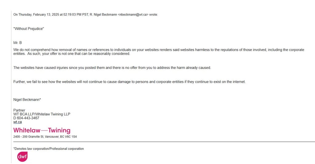 19 JANUARY 2025 WITHOUT PREJUDICE/RESERVATION OF RIGHTS On 23 December 2024, a Partner of Whitelaw-Twining fired off an email (excerpted below), wherein he threatened to widen the already contentious, costly litigation of the subject case before the BC Supreme Court (BCSC case no. VLC-S-S-244577). It is respectfully brought to Whitelaw-Twining's attention that this threatened action is highly inimical to the strict policy objectives that the Court requires; to wit: The British Columbia Supreme Court Civil Rules, such as Rule 9-1, include provisions designed to encourage litigants to seek extrajudicial remedies prior to filing formal Motions and Applications. These rules emphasise proportionality, early resolution, and case management, in order to ensure that disputes be resolved in a just, speedy, and inexpensive manner. Thus, In accordance with the aforementioned authority, the creator of this public interest website, a Named Insured of Whitelaw-Twining's Insurer Client, offers to Whitelaw-Twining, its Insurer Client and its personnel, the unconditional option to revise the website, subject of the aforementioned litigation, by the deletion or other method, of any and all specific words that Whitelaw-Twining, its Insurer Client and/or its personnel should claim to be defamatory. Upon Whitelaw-Twining's timely submission of a list of specific words to be deleted or otherwise revised, with an indication as to the name and position in the company occupied by the Requestor, the website will be revised to reflect such instruction. There is no requirement that any Requestor provide any explanation or justification, in order to exercise this option. Furthermore, once the website is modified, according the dictates of the Plaintiffs, it will be permanently locked and remain indefinitely in such modified state. This offer does not apply to this website, or to any demands or ultimata to summarily deactivate the other website in its entirety, without reference to specific words. THE SOLE PURPOSE OF THIS OFFER IS THE JUDICIALLY REQUIRED EFFORT TO RESOLVE LITIGATION, AND IS NOT TO BE CONSTRUED OR INFERRED AS ANY OFFER TO RESOLVE DAMAGES, OR ADMISSION THAT ANY ELEMENT OF THIS WEBSITE IS, OR HAS EVER BEEN DEFAMATORY. ANY AND ALL ATTEMPS TO USE THIS OFFER, IN ANY CIRCUMSTANCE OR EVENT, MUST BE ACCOMPANIED BY THIS DISCLAIMER.