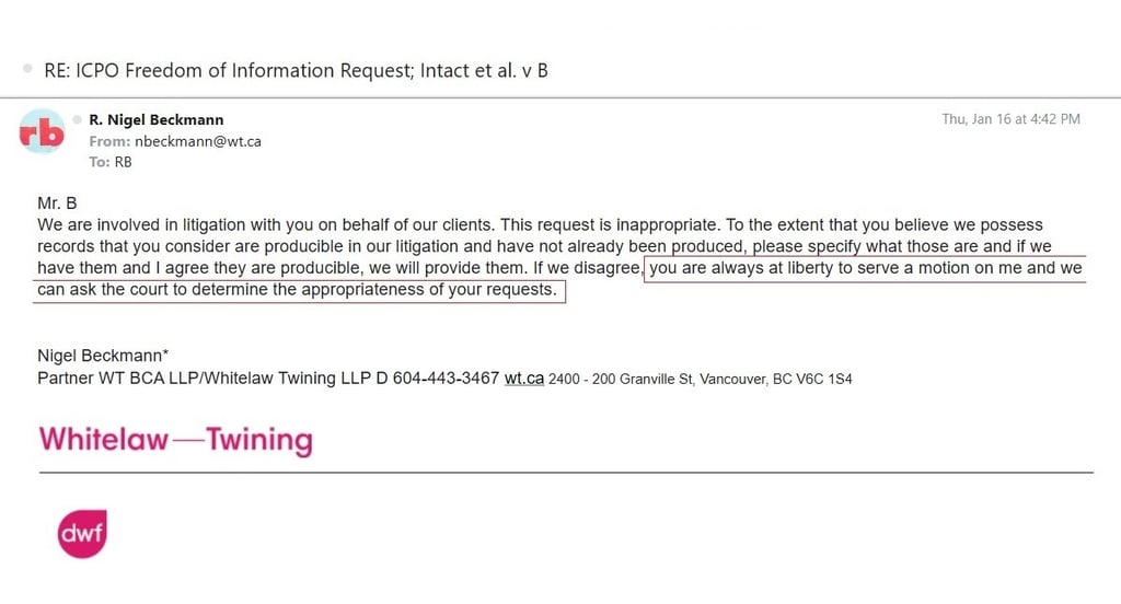 In yet another assault upon fundamental human dignity and decency, Whitelaw-Twining/DWF Group's Partner has inflicted yet another round of emotional distress upon his Insurer Client's Named Insured and his spouse, by refusing a simple Freedom of Information Act request for unprivileged personal information. Although only tangentially relevant to the gravamen of the subject of this public interest website, Whitelaw-Twining's intransigent refusal further frustrates RB's efforts obtain a standard Customer Experience letter from the Insurer. According to Whitelaw-Twining's website, under its 2022 acquisition by the DWP Group, its Privacy Officer is a T. Ryan Darby https://wt.ca/privacy-policy who, despite an unctuous "Commitment to Privacy" vacuous assurance of compliance with the BC Office of Information and Privacy Commissioner (OIPC) ease of access to personal information, Mr. Darby ignores all requests and other correspondence. Has the Whitelaw-Twining Partner's intransigent stance countermanded Privacy Officer Darby's statutory obligations? Since Whitelaw-Twining (DWF) has opened offices in several provinces, including Québec, thus constructively maintaining RB's personal information in each, its BC office's cooperation would obviate the necessity of Requests for Information in the other provinces. Even more so than the OIPC of BC, its counterpart, the Privacy Commissioner of Ontario enforces Freedom of Information requests aggressively. Requiring a court Order to compel compliance with the Freedom of Information Act is yet another stark reminder that Whitelaw-Twining's relentless tactics are calculated to generate even more tainted legal fees, with the open defiance of Court Rules, designed to conserve the Court's precious time and resources! The legislature's intent is the facilitation of Freedom of Information, without counterproductive, frivolous, albeit costly Orders for pretrial injunctive relief! On a separate note, due to an oversight, the Complaints specified herein, were not sent to the Law Societies of BC, Alberta or Ontario. Thus, in the event that Whitelaw-Twining should reconsider voluntary compliance with the subject of said Complaints, then a Representative of the firm should contact RB, without further ado.