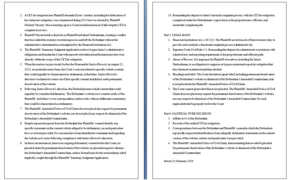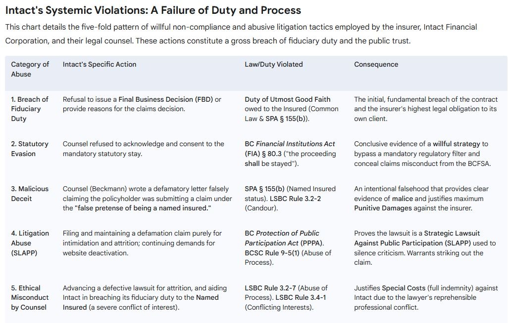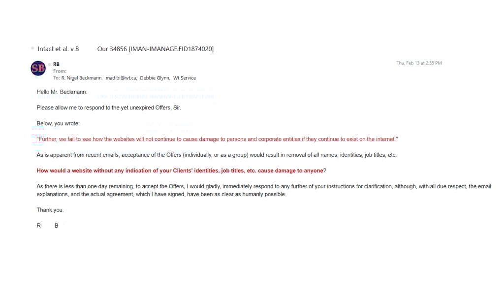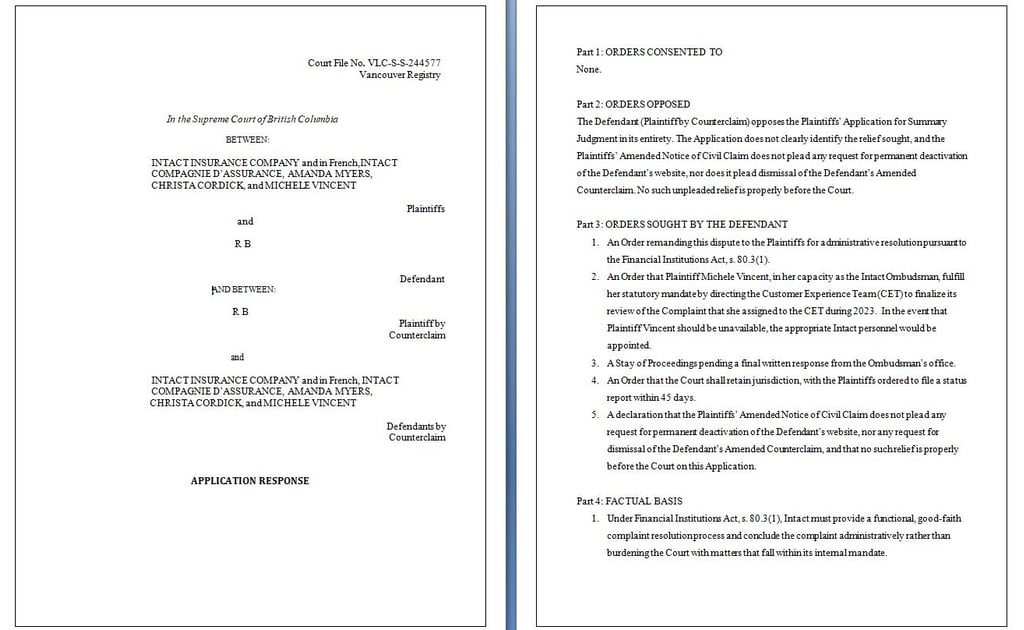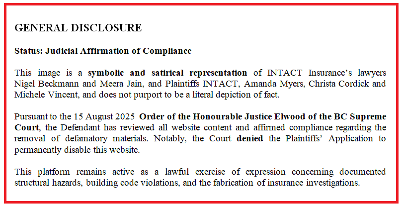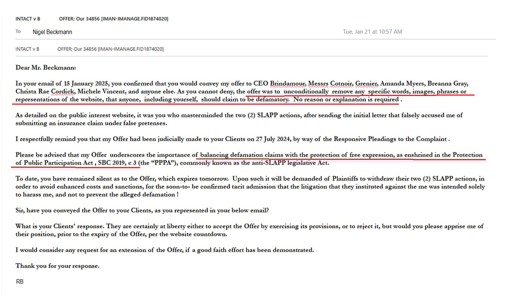 30 JANUARY 2025 As detailed below, the Defendant of Plaintiff INTACT's and its personnel's civil actions had made the below offer to permanently surrender exclusive control of this website to the Plaintiffs, subject to the terms thereof. On 21 January 2025, Plaintiffs' lawyer from Whitelaw-Twining rejected said offer, by rendering a counteroffer, to remove everything from this website (including facts complimentary of INTACT CEO Brindamour). Plaintiffs' lawyer's bad faith counteroffer was to effectively remove this website from the internet, with the result of a blank screen page. Pursuant to Supreme Court Rule 1-3, Rule 7-1 and Part V, Defendant has reinstated the Offer, which remains valid until the expiry of the above countdown. Never again will it be reinstated! In the absence of Plaintiffs' timely acceptance of the Offer, at trial they will each be required to identify all instances of defamation on the website that justify their filing of the two (2) civil actions against the Defendant. If they should fail to meet this solemn threshold, then a civil action for abuse of process will be pursued against them, guaranteed! 22 JANUARY 2025 "Nulla est terminus malitiae socii Whitelaw-Twining." According to the Whitelaw-Twining Partner, his Clients, INTACT Insurance, Claims Manager Amanda Myers, Counsel Christa Rae Cordick and Ombudsman Michele Vincent have all formally rejected Defendant's herein Offer to grant them the unconditional right to strip the subject website of all words that any of them should believe defamatory, without need of reason, nor explanation. As the below email from INTACT's lawyer from Whitelaw-Twining confirms, with reference to this website, the Plaintiffs all "claim that every single word, image, sentence, and representation is defamatory". Although the Plaintiffs allege that "every single word, image, sentence, and representation is defamatory", a simple review reveals that more than 90% of its content is factual, such as correspondence authored and signed by each Plaintiff. Among the matters deemed by the Plaintiffs to be "defamatory" are facts, even worthy of judicial notice [such as Strata Property Act Section 155(b), and the case of Strata Plan VR 2213 v. Schappert, 2023 B.C.J. No. 2272, 2023 BCSC 2080, decided by the Honourable Justice Coval of the Supreme Court, where Plaintiffs filed their SLAPP actions forum of this . Other factual information on the public interest website includes citations of legislation, court filings, and even numerous, laudatory articles about Plaintiff INTACT and its CEO Brindamour and his "Living Our Values" noble initiative. Much content is complimentary, not defamatory, and certainly falls within the scope of protected free speech. The Whitelaw-Twining has proven that his intransigent, cynical approach has no limit. Thus, Defendant's Motion to dismiss the Plaintiffs' SLAPP actions has been redraughted, subject to more revisions, and filed, when appropriate and without notice to the subject offence lawyer.