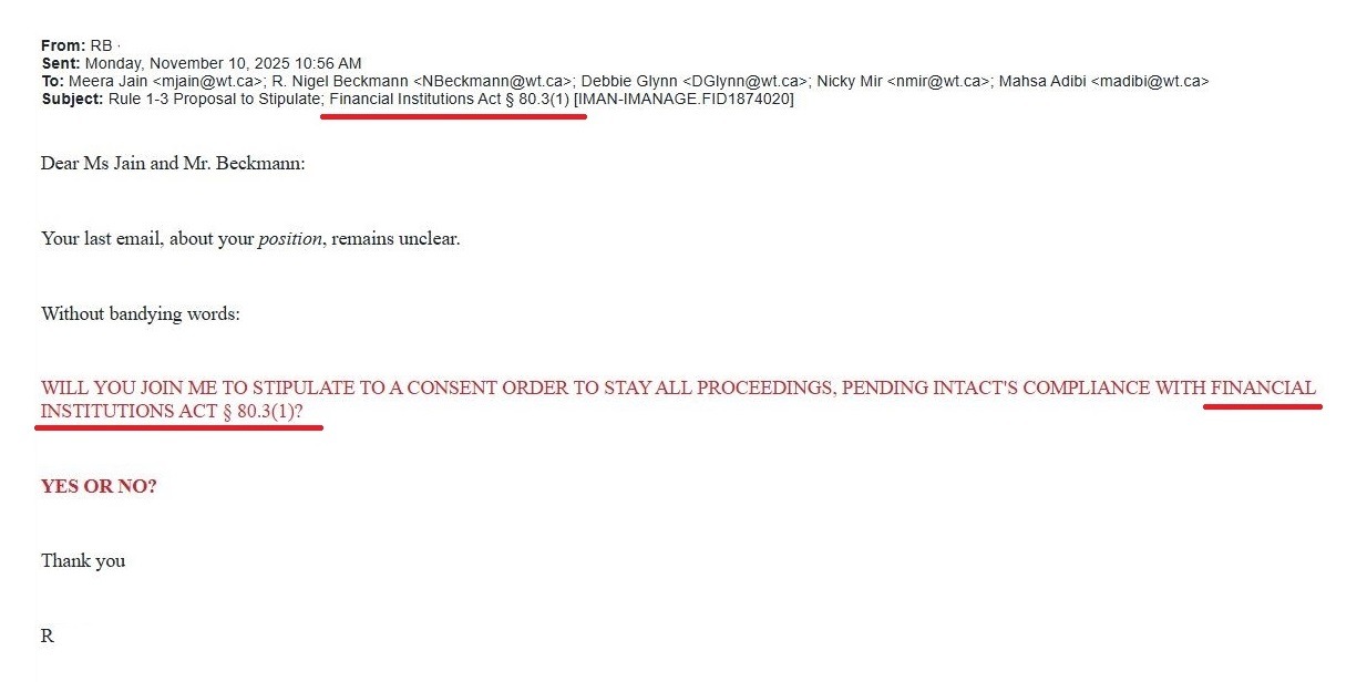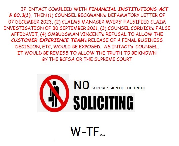Commencing with Whitelaw-Twining Partner Nigel Beckmann's defamatory letter of 07 December 2023, abetted by Associate Counsel Meera Jain's recent emails, infra, the firm has been able to dissuade its Client INTACT Insurance from compliance with Financial Institutions Act § 80.3(1) and Court Rule 1-3. Whitelaw-Twining has been the recipient of INTACT Insurance's tens of thousands of dollars investment into non-compliance of federal and provincial regulations. Since Whitelaw-Twining's SLAPP actions continue, unabated, the below Form 26 Notice to Admit, will concretise the germane issues for trial of the meritless Amended SLAPP action, as well as the meritorious Amended Counterclaim.
