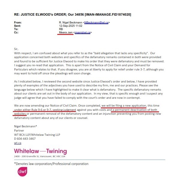 WHITELAW-TWINING LAWYER MEERA JAIN IS THE COUNSEL FOR INTACT INSURANCE AND THE THREE (3) HUMAN SLAPP PLAINTIFFS. AS CONFIRMED BY THE BELOW EMAIL, ATTORNEY JAIN HAS NOTIFIED THE SLAPP DEFENDANT OF HER INTENTION FILE A RULE 9-6 or 9-7 APPLICATION (FOR A REHEARING, BY A DIFFERENT JUSTICE) OF AN ORDER ISSUED TO HER ON 13 AUGUST 2025, BY THE HONOURABLE JUSTICE ELWOOD OF THE BC SUPREME COURT.