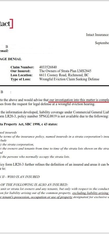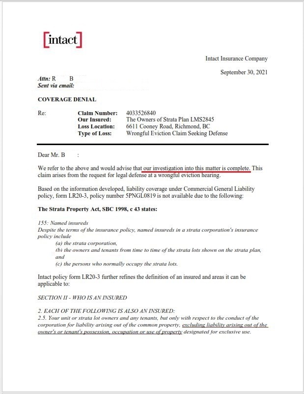 Strata Property Act Section 155(b) (2) the landmark case of Strata Plan VR 2213 v. Schappert, 2023 B.C.J. No. 2272, 2023 BCSC 2080 (decided by the Honourable Justice Coval of the BC Supreme Court), correspondence of INTACT Claims Manager Amanda Myers, INTACT lawyer Christa Rae Cordick, Adam Trott investigator of the BC Ombudsman Office, Bruno de Sando investigator of the GIO, Patrick Williams of renowned law firm Clark Wilson, CHOA (Condominium Homeowners Association of BC), the BCFSA, personnel of various Scheduled Insurers of the subject INTACT property liability policy, Insurance Broker Gordon Li, Property Manager Nico Barbu, Sedgwick Insurance Sr Adjuster Daphne Chan, Heather Bidnall, Compliance Officer of the Insurance Council of BC, Dr. Leo Perra, LMS 2845 Strata President, Alexandre Korecki Property Management Owner, Nico Barbu Property Manager, Scott Chen Unit 1702 Owner, Humane Solutions Remediation Specialist, Mike Blackall, Property Manager, Ray Nouri LMS2845 Building Superintendent, and others.