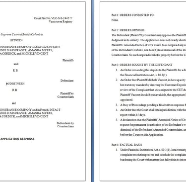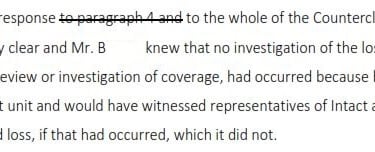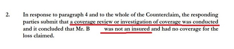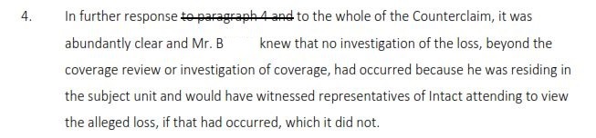 As indicated by the letter to the right, INTACT had confirmed the Claimant's status as a Named Insured of the company. However, as indicated by his letter to the left, Whitelaw-Twining's Partner contradicted INTACT's confirmations of the Claimant's status, by his false charge, defamatorily and falsely accusing the Claimant of submission of the insurance claim under the false pretence of being an insured. Below is a legal pleading of an INTACT lawyer, confirming the Claimant's legal status as a Named Insured.