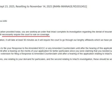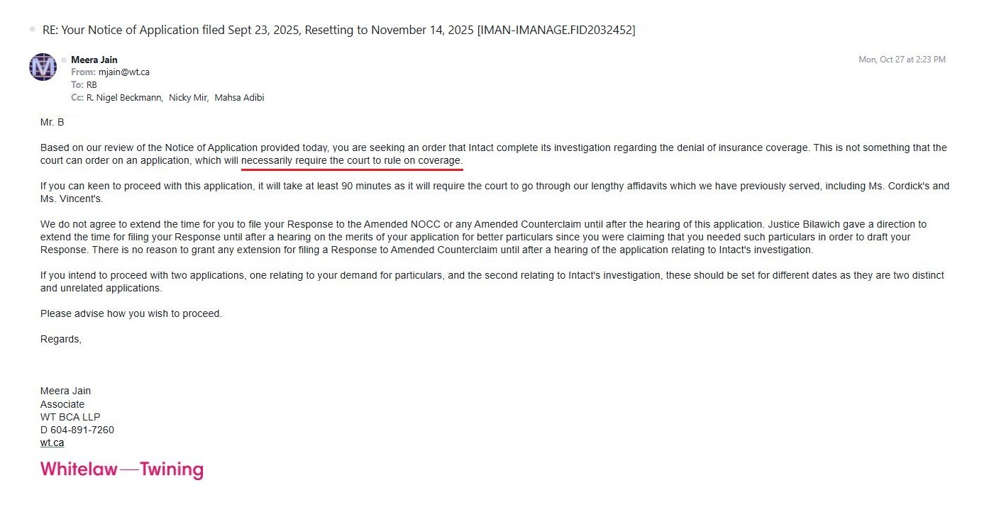 "Based on our review of the Notice of Application provided today, you are seeking an order that Intact complete its investigation regarding the denial of coverage. This is not something that the court can order on an application, which will necessarily require the court to rule on coverage"
