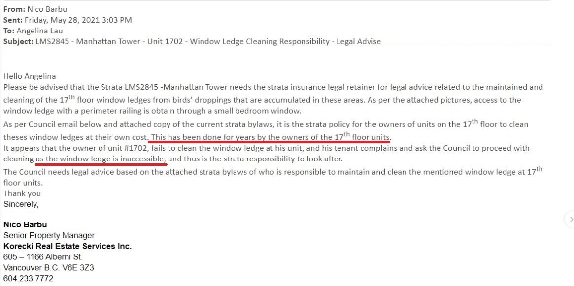 3. Necessity of Professional Action: De jure fiduciaries of the Strata Owners (Attorneys Lauren Liang, Meera Jain, Nigel Beckmann, Property Manager Mike Blackall and Insurance Broker Gordon Li have been duly notified of these and other issues, in order to ensure that the building’s risk profile be accurately managed. Taking proactive action allows the tripartite group to address these lifecycle failures before they result in sudden structural or mechanical loss.