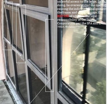 This summary provides legal notification, regarding structural conditions observed during a professional remediation project, by a team engaged and compensated by the SLAPP Defendant Tenant of unit 1702. During the project, the team members used safety gear to prevent falling from the sloping, unstable window ledge, infra.