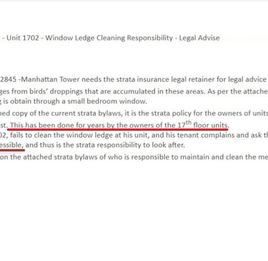Here is a summary of the illicit activities Whitelaw-Twining's Partner's Claims Manager Client, in the case against an Insured of his Insurer/Client's Named Insured. To the right is an image of an ornamental pigeon roost ledge, situated next to a window of the Partner's Client's Named Insured's 17th floor residential unit. As indicated in the image, the ledge was laden with large amounts of contaminated, toxic spore-producing pigeon faecal matter. The building Strata Corporation (also an Insured of the Whitelaw-Twining Partner's Insurer/Client) refused to abate the health hazard, so the Named Insured occupant submitted a First Party claim with Whitelaw-Twinging's Insurer Client.