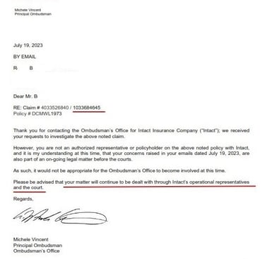 As fully documented on this public interest website, INTACT's Privacy Officer, whistleblower Helen Cameron had discovered that Alberta Claims Manager Amanda Myers, had invented that she had conducted an investigation of a claim, which had been assigned to her. The Claimant, Administrator of this website, then filed a formal Complaint with INTACT Ombudsman, Michele Vincent, who assigned the Complaint to INTACT's Customer Experience Team. However, in an illegal act to conceal the legal and regulatory consequences of the Claims Manager's wrongful claims activities, the Ombudsman instructed the Customer Experience Team never to release its findings of the Claim Manager's unlawful claims practices. Thus, after one year, seven months, the Customer Experience Team's Complaint investigation remains in perpetual suspension.