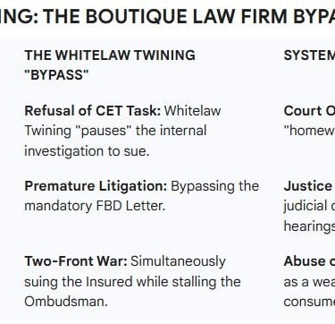 When the INTACT Named Insured Claimant created the factual website, INTACT, rather than to rectify the Claims Manager's wrongful claims denial, the company engaged a Partner of a Whitelaw-Twining (DWF Group), who, in an attempt to intimidate the Claimant into withdrawing his claim, falsely and defamatorily accused the Claimant of having submitted the claim under the false pretence of being an Insured. When the Claimant refused to succumb to the Lawyer's extortive threats, the Lawyer filed two (2) lawsuits against the Claimant, who looks forward to the trial, at which the Plaintiffs and their instigator, percipient witness Lawyer will all be examined, under oath, and their illicit involvement finally be subject to judicial scrutiny and exposure!