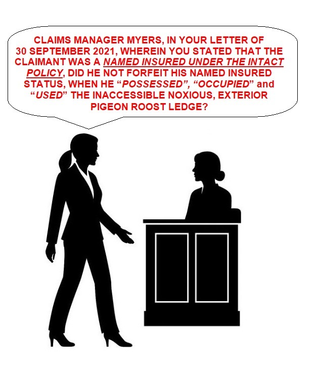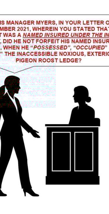 Faced with the "dilemma" of having to process and possibly pay a claim, the Partner's Insurer/Client's Claims Manager devised a scheme [which she has refused to renounce for more than three (3) years], that the Named Insured had physically "possessed", "occupied" and "used" the ornamental pigeon roost ledge, thus triggering the policy exclusion. The roost is physically inaccessible from the Named Insured’s high rise unit. The ledge is devoid of any means of ingress/egress. It is legally, physically and architecturally, common property; not part of any unit of the residential building.