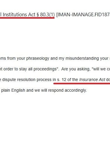 Although the above is fictitious, the solemnity of the problem for INTACT Insurance is Whitelaw-Twining's below email, which belies the fact that despite the rhetoric, the firm's SLAPP Prosecutors are resolute in their relentless opposition to the extrajudicial resolution embodied in the above regulatory statutes, as well as the overriding principal of Court Rule 1-3 - the just, speedy, and inexpensive determination of every proceeding. Furthermore, by the filings of countless, repetitive Applications, that accomplish no more than fees, the firm's assigned lawyers defy, at every juncture, the precise legislative intent of administrative remedies, in lieu of those judicial!