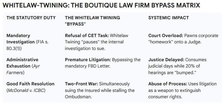 The firm is also the Counsel of INTACT Financial Corporation, the largest provider of property and casualty (P&C) insurer in Canada. Under Whitelaw-Twining's relentless guidance, INTACT has achieved the dubious distinction of being a major abuser of the judicial system, contributing to this "breaking point" by filing meritless, even duplicative SLAPP actions and Court Applications, in an extremely well funded scheme to avoid the mandatory administrative tasks under Financial Institutions Act § 80.3(1) and § 94.1